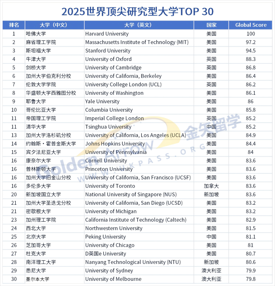 为方便同学们查看,这里整理了本次排名的TOP30中英文对照榜单: