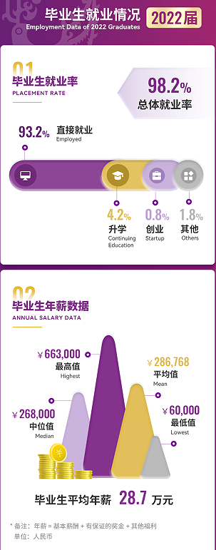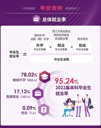 除了政策上的便利,港中深毕业生的就业质量也是杠杠的。根据港中深发布的《2022届本科毕业生就业质量报告》,2022届本科毕业生总体就业率保持高位稳定,达95.24%。其中继续深造比例为78.02%,升学毕业生中,72.30%攻读世界排名前50名的名校硕士/博士学位。可见,港中深的本科背景在世界范围内的认可度都是足够高的,用来申请研究生相当香。